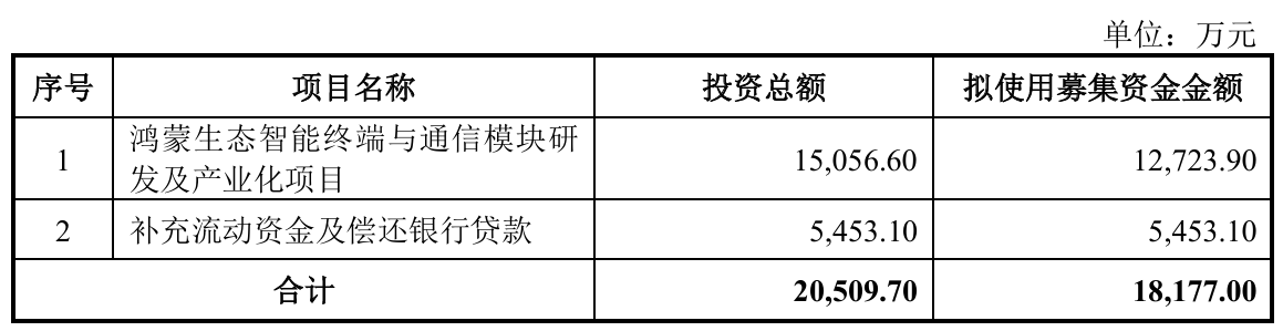 据公告,扣除相关发行费用后的募集资金净额拟投资于以下用途:鸿蒙生态智能终端与通信模块研发及产业化项目,总投资约1.51亿元,拟投入募集资金约1.27亿元;补充流动资金及偿还银行贷款项目,总投资5453.1万元,拟投入募集资金5453.1万元。
